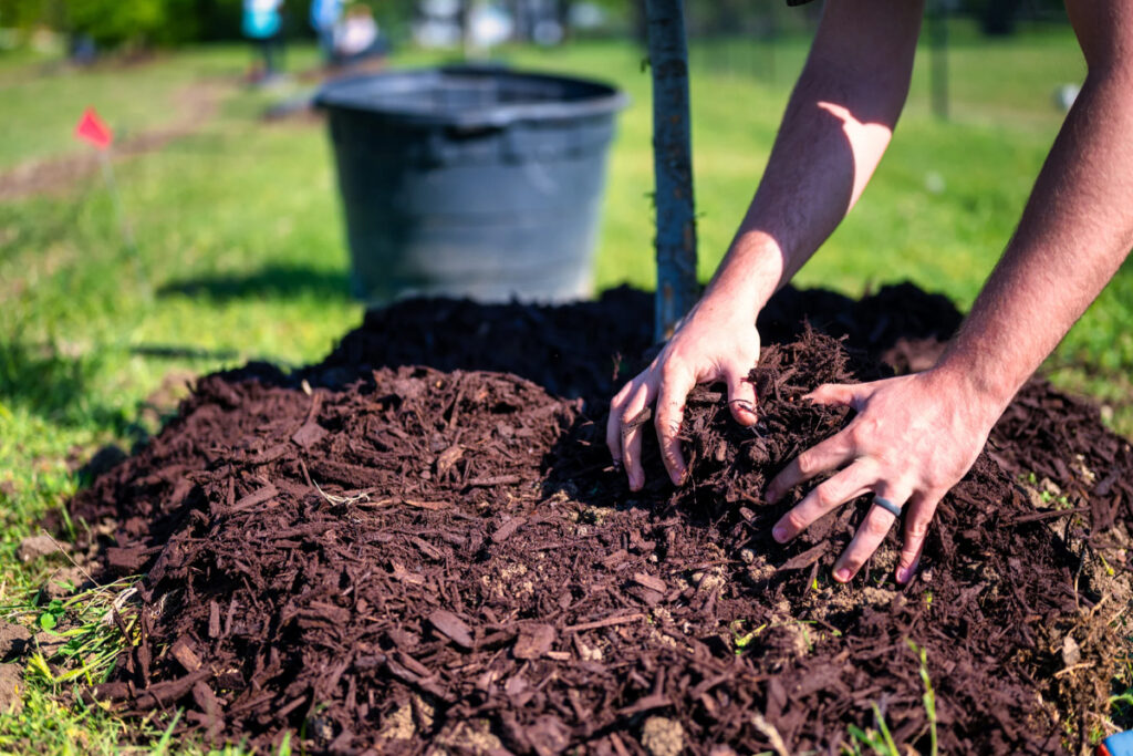 Professional mulching services applying high-quality mulch to garden beds, shrubs, and trees to conserve moisture, prevent weeds, and improve appearance.